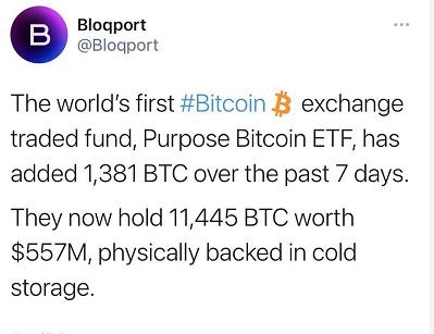 数据:Purpose旗下比特币ETF现拥有超1.1万个BTC