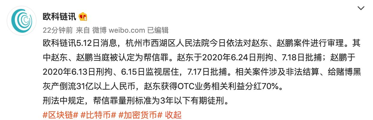 链捕手消息,杭州市西湖区人民法院今日依法对赵东、赵鹏案件进行审理。其中赵东、赵鹏当庭被认定为帮信罪。赵东于 2020 年 6 月 24 日刑拘、7 月 18 日批捕;赵鹏于 2020 年 6 月 13 日刑拘、6 月 15 日监视居住、7 月 17 日批捕。相关案件涉及非法结算、给赌博黑灰产倒流 31 亿以上人民币,赵东获得 OTC 业务相关利益分红 70%。刑法中规定,帮信罪量刑标准为 3 年以下有期徒刑。(欧科链讯)