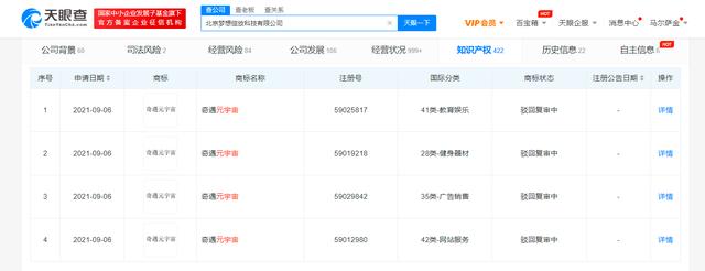 链捕手消息,近日,爱奇艺关联公司北京梦想绽放科技有限公司申请注册的多个“奇遇元宇宙”商标状态变更为“驳回复审”,国际分类包括教育娱乐、健身器材、广告销售等,商标申请于2021年9月。