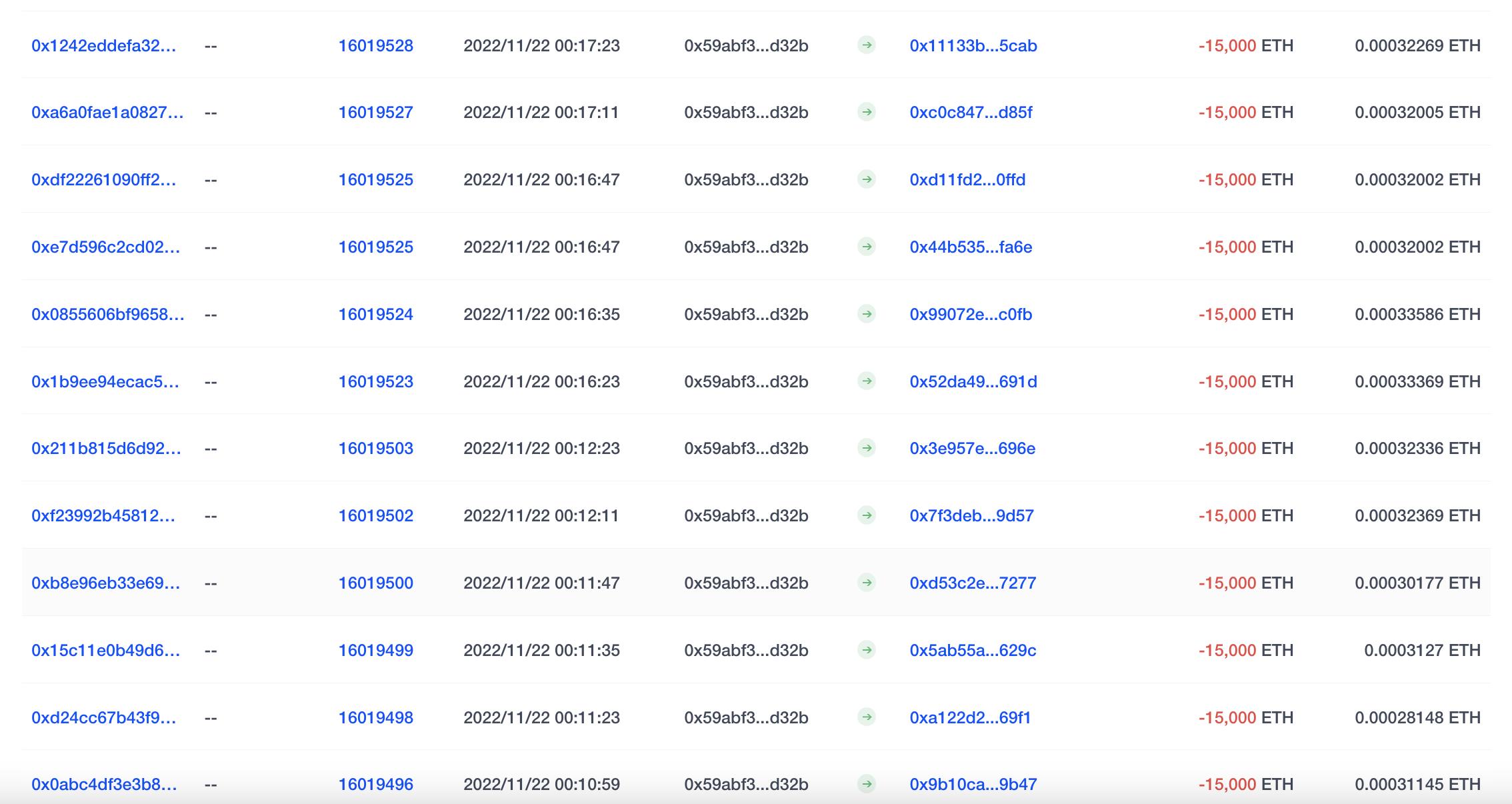 ChainCatcher 消息,欧科云链 OKLink 多链浏览器数据显示,被标记为“FTX Accounts Drainer”的地址(以 0x59a 开头)今晨 00:10:59 开始,以 1500 ETH 为单位进行了 12 笔大额资金转移,累计转出 18 万枚 ETH,价值超 1.98 亿美元。截至目前,该地址还持有约 5,735 枚 ETH,约合 630 万美元。