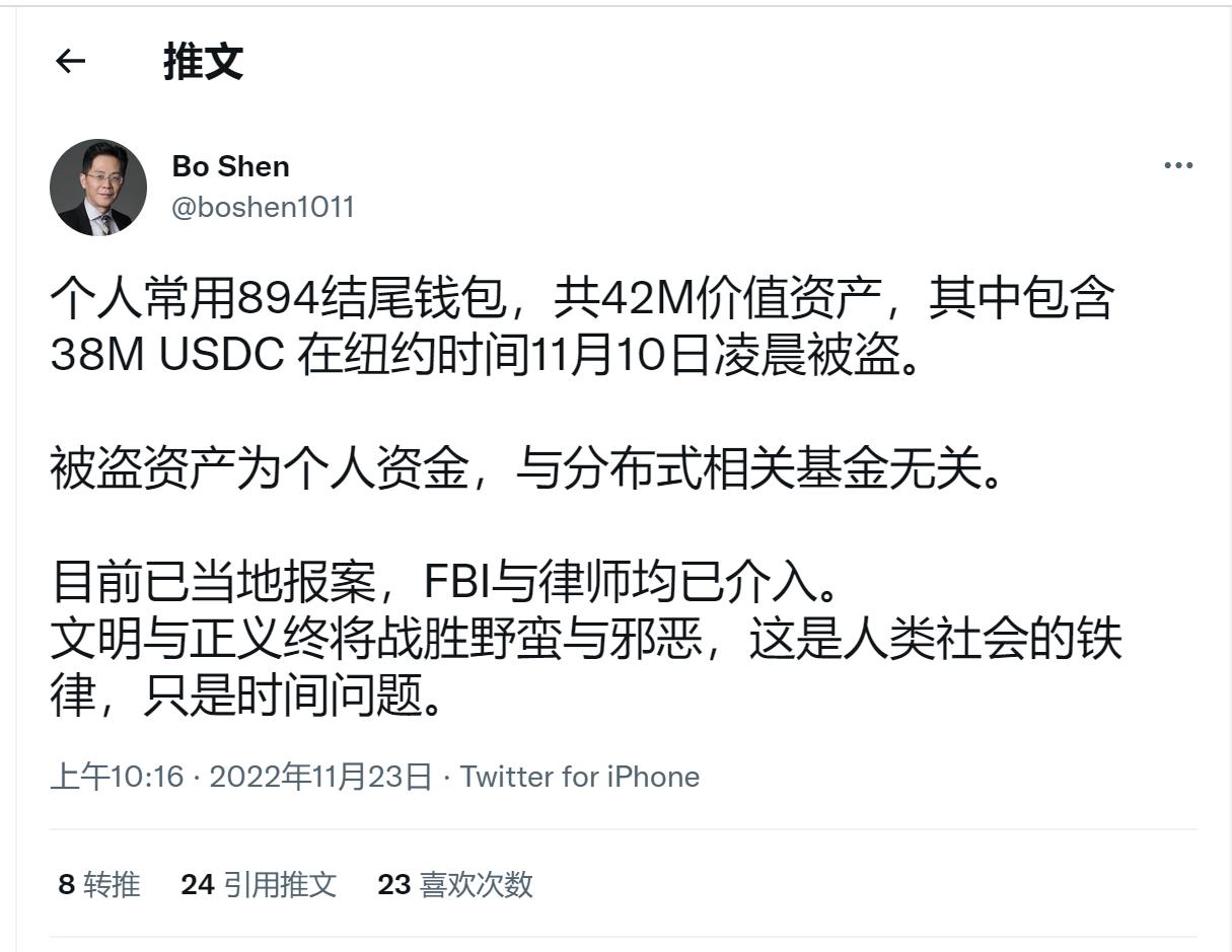 ChainCatcher 消息,分布式资本合伙人沈波发布推特表示,“个人常用 894 结尾钱包,共 42 M价值资产,其中包含 38 M USDC,在纽约时间 11 月 10 日凌晨被盗。被盗资产为个人资金,与分布式相关基金无关。目前已当地报案,FBI 与律师均已介入。文明与正义终将战胜野蛮与邪恶,这是人类社会的铁律,只是时间问题。