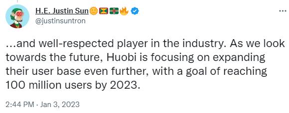孙宇晨:2023 年 Huobi Global 的目标是达到 1 亿用户
