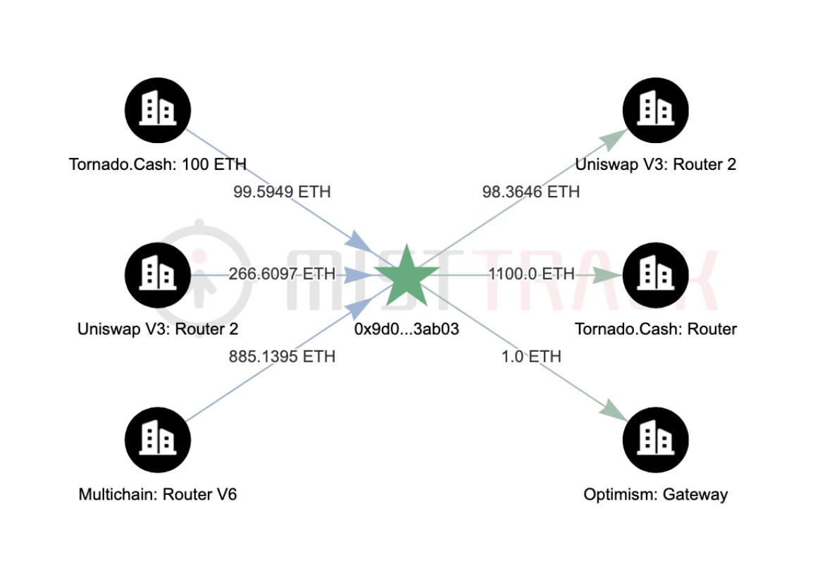 ChainCatcher 消息,据慢雾区情报,HECO 生态跨链借贷平台 LendHub 疑似被攻击,主要黑客获利地址为 0x9d01..ab03。黑客于 1 月 12 日从 Tornado.Cash 接收 100 ETH 后,将部分资金跨链到 Heco 链展开攻击后获利,后使用多个平台(如 Transit Swap、Multichain、Uniswap、Curve 和 Optimism Bridge)跨链或兑换被盗资金。