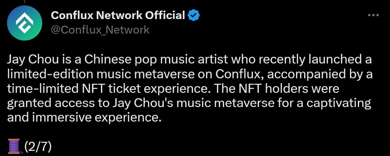 ChainCatcher 消息,Conflux 发推表示,“周杰伦在 Conflux 上推出了限量版音乐元宇宙,并附有限时 NFT 门票体验,NFT 持有者获准进入周杰伦的音乐元宇宙,以获得身临其境的体验”。随后半小时内 Conflux 删除了此条推文。