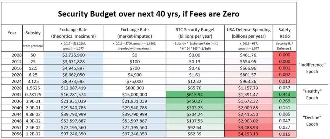 上表描绘了比特币安全预算的变化趋势,各行代表不同的年份。其中理论最大汇率上限取自 Game and Watch 的论文。表中估算的市场汇率由历史数据和增长因子计算所得,同时为了更快地达到理论上限而进行了一些额外的处理。美国国防预算一列通过维基百科的数据估算所得。“安全比例” 是指从国防预算中划出多少的比例就可以成功摧毁比特币。上述所有数据都以美元名义表示。