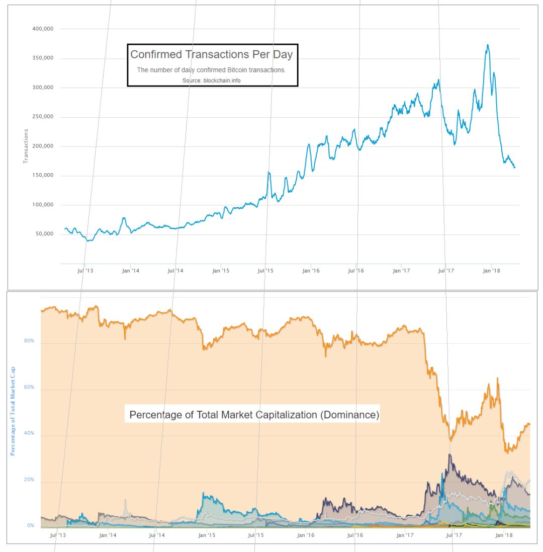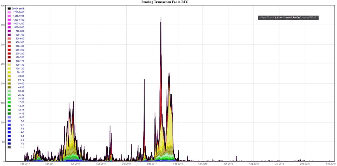 我们可以看到比特币在 2017 年 5 月跨过了“1 美金交易费红线”,这一趋势和山寨币的崛起相一致。同样可以看到 2017 年底 “交易费压力” 的迅速消失,然后再小幅度显现。最终可以看出,这种压力的释放和比特币网络中交易量的骤减(史无前例的降幅)相一致。
