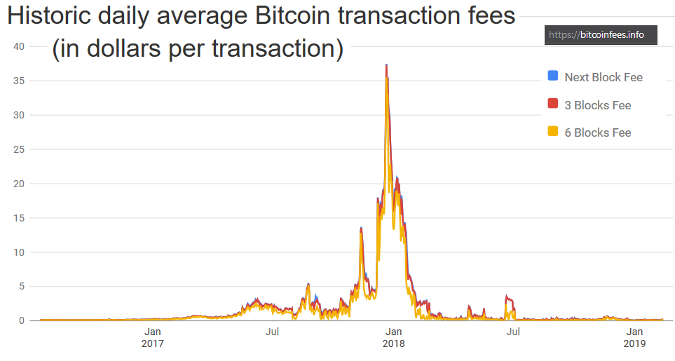 下图是以比特币定价的交易费(图源自这个网页):