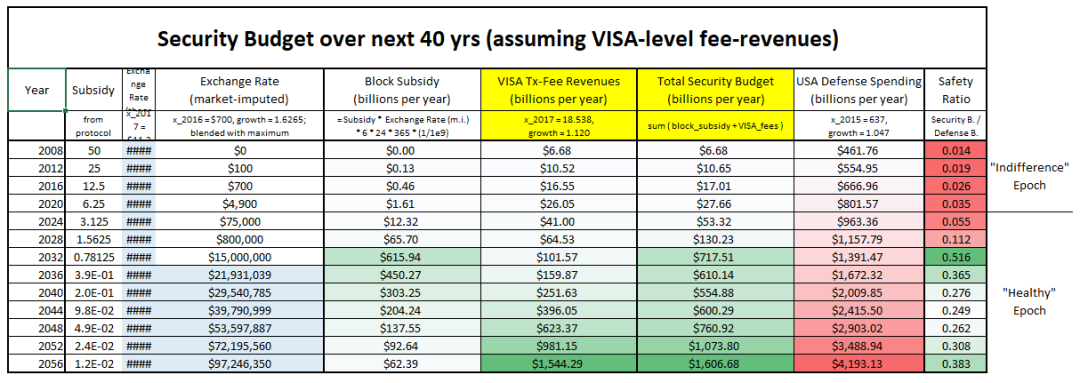 上表是上文中的 “安全预算表” 加入了新的一栏:VISA 交易费。这些交易费加上基础的区块奖励,算得了最终的新安全预算。