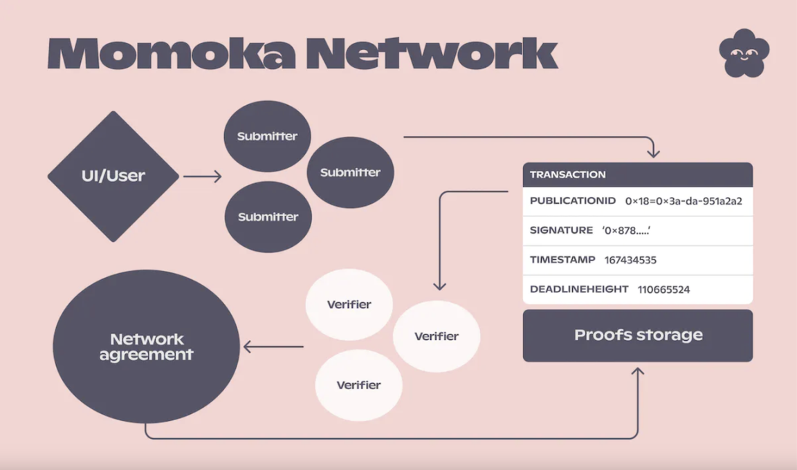在Momoka网络中,主要有两个角色,包括提交器(Submitters)和验证器(Verifiers)。前者负责验证交易数据并构建数据提交给Arweave,目前由Lens官方指定的白名单地址负责;后者负责监控提交器提交的数据有效性并惊醒确认,支持任何人都可以使用Momoka节点验证器(Verifiers)来证明和验证交易。