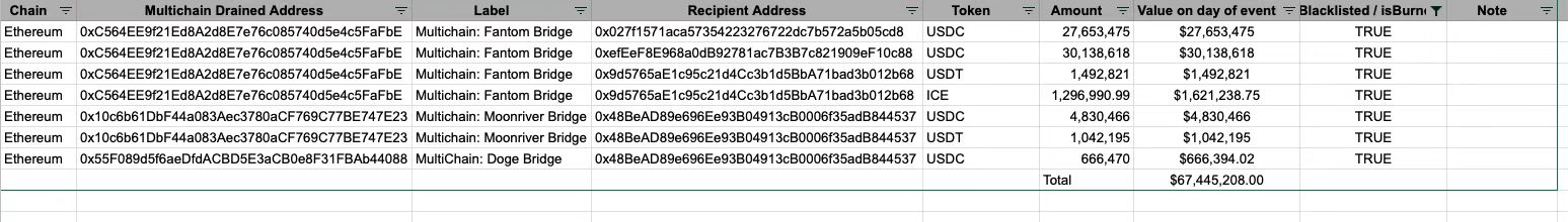 流出的资金中,包括:1)从 Multichain: Old BSC Bridge 转出的 USDT;2)从 Multichain: Fantom Bridge 转出的 USDC、DAI、LINK、UNIDX、USDT、WOO、ICE、CRV、YFI、TUSD、WETH、WBTC;3)从 Anyswap: Bridge Fantom 转出的 BIFI;4)从 Multichain: Moonriver Bridge 转出的 USDC、USDT、DAI、WBTC;5)从 MultiChain: Doge Bridge 转出的 USDC;6)从 Multichain: Executor 转出的 DAI、USDC、BTCB、WBTC、WETH、Dai.e、WBTC.e、Bridged USDC、BTC、fUSDT、ETH 等;7)从被 Etherscan 标记为 Fake_Phishing183873 的 0xe1910...49c53 转出的 WBTC、USDT、ETH,同时慢雾认为该标记(Fake Phishing183873)或许是 Etherscan 上的虚假标记,地址可能以前属于 Multichain 官方账户。