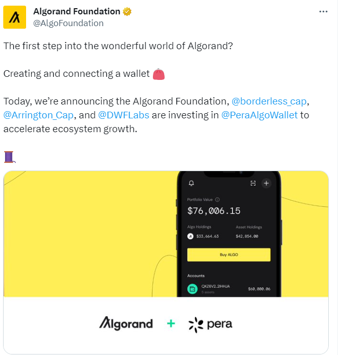 ChainCatcher 消息,Algorand 基金会宣布联合 Borderless、Arrington Capital 和 DWF Labs 对 Algorand 生态开源自托管钱包 Pera 进行投资,以促进生态系统的发展。
