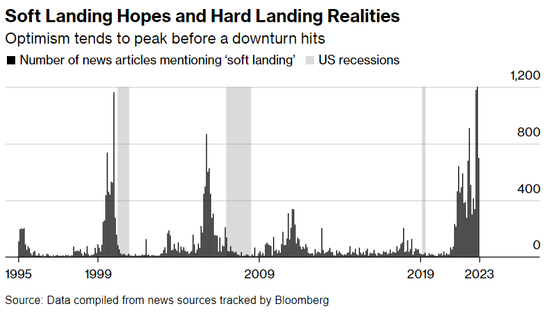 所以究竟是所有人都认为衰退会发生还是都认为不会发生?比起感觉,我更喜欢看数据。彭博的数据显示了目前“软着陆”的呼声有多高。