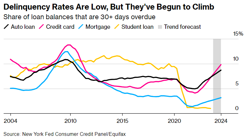 美国的 GDP 贡献中,消费超过八成。如今 80% 的美国居民手头的现金比 Covid 之前还要少,银行贷款在不断收紧,而贷款违约率却在不断攀升,这种情况下一旦失业率开始拐头向上,衰退将不可避免。