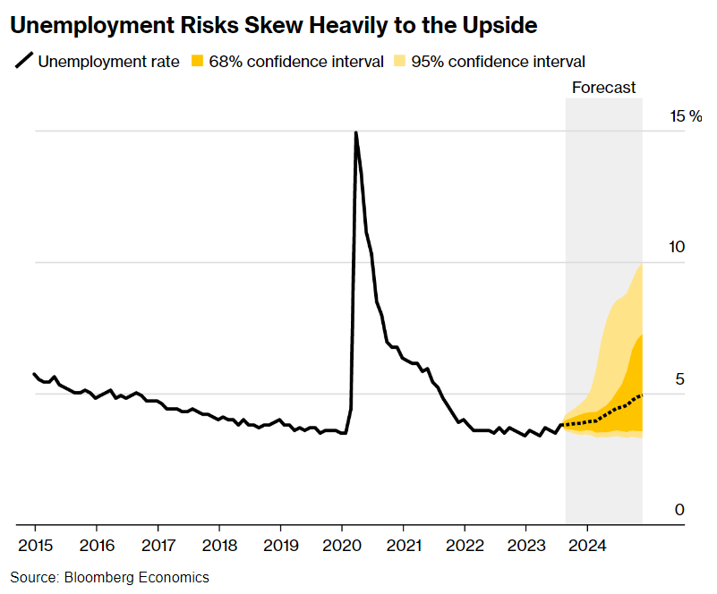 但如果数据在上升趋势中突然出行大幅下降呢?基于此,彭博建立了一个预测失业率的分布模型。