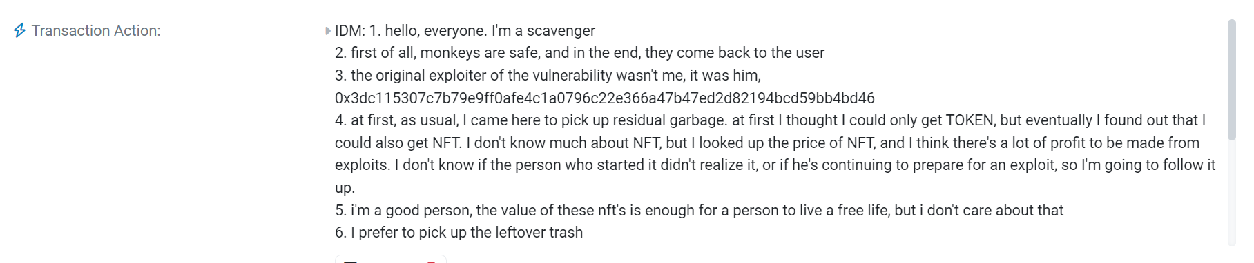 ChainCatcher 消息,此前 NFT Trader 遭遇攻击,多枚 BAYC 和 MAYC 被提至 0x909 开头地址。该地址随后在链上留言,表示自己不是漏洞的始作俑者,只是恰好发现并利用该漏洞,真正的黑客是 0x3dc...bd46。