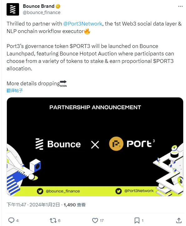 ChainCatcher 消息, Bounce Brand 于 X 平台发文表示,Port3 治理代币 PORT3 将于 Bounce Launchpad 上推出,将使用 Bounce Hotpot 拍卖,参与者可以从各种代币中进行选择,并按比例获得 PORT3 分配。