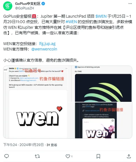 GoPlus:大量针对 Jupiter LaunchPad 项目 WEN 空投钓鱼诈骗发生,请认准官方渠道
