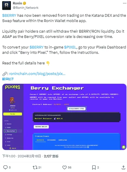 Ronin Network:建议用户将 BERRY 转换为游戏中的 PIXEL