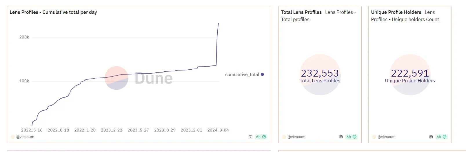 ChainCatcher 消息,据 Dune 数据显示,截至 3 月 7 日,Lens Profiles NFT 铸造量已累计增至 232,553 个,持有地址总数为222,591。