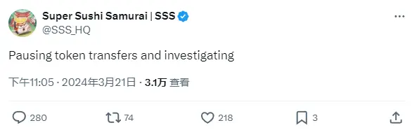 Blast 生态项目 Super Sushi Samurai 疑遭攻击,团队已暂停代币转移并进行调查