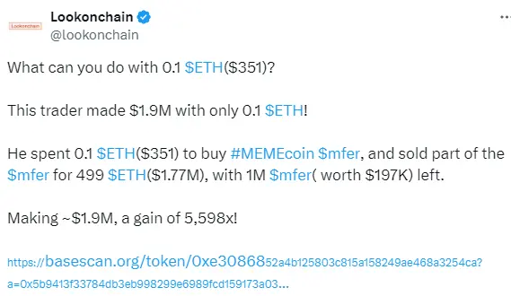 ChainCatcher 消息,据 Lookonchain 监测,0xe308 开头地址花费 0.1 ETH(351 美元)购买 Base 链 Meme 币 MFER,并以 499 ETH(177 万美元)的价格出售了部分,仍持仓 100 万枚 MFER。该地址通过此次交易赚取约 190 万美元,收益达 5598 倍。