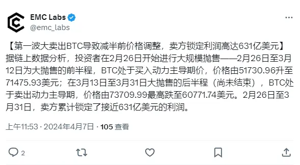 ChainCatcher 消息,EMC Labs 发布 3 月报告指出,投资者自 2 月 26 日开始进行大规模抛售,导致比特币价格下跌。抛售分为前后两阶段,其中前半段价格从 51730.96 美元上涨至 71475.93 美元,后半段价格跌至 60771.74 美元。总体来看,卖方锁定了近 631 亿美元的利润。
