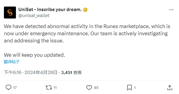 UniSat:符文市场存在异常活动,目前正在紧急维护中