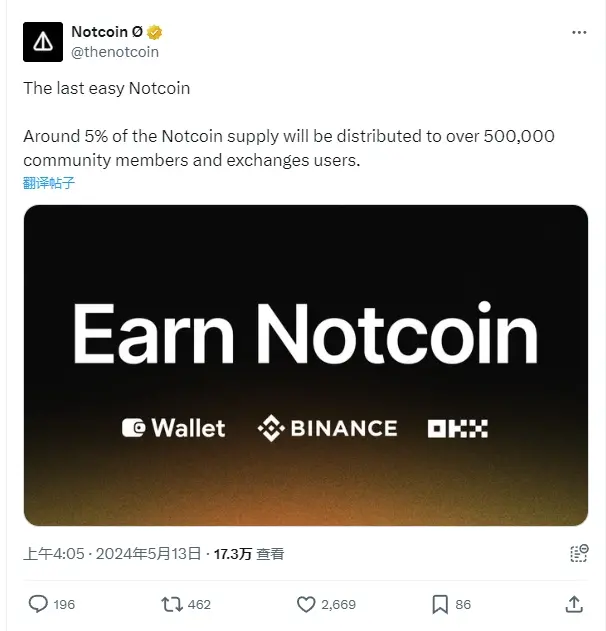 Notcoin:约 5% 的 NOT 供应量将分发给币安 launchpool、OKX jumpstart 等用户
