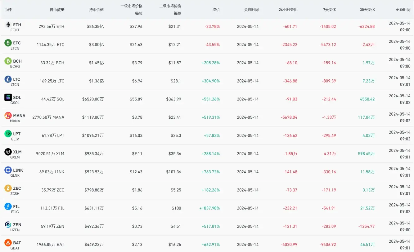 此外,灰度 BCH 信托溢价率为 205.28%,LTC 信托溢价率为 304.90%,SOL 信托溢价率为 551.26%,MANA 信托溢价率为 519.31%,LINK 信托溢价率为 763.72%,FIL 信托溢价率为 1837.98%。