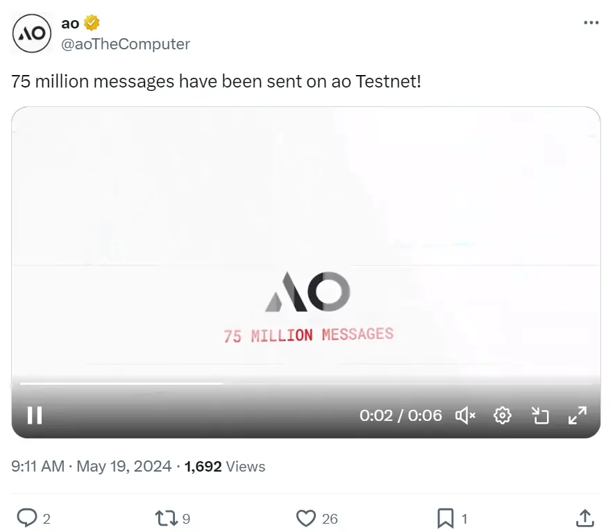 此前报道,2月27日 Arweave 发布公共测试网 Arweave AO ,用于为社交媒体、 AI 设计计算层。未来,团队预计在2024年最终主网之前对 Arweave AO 进行多次审计。