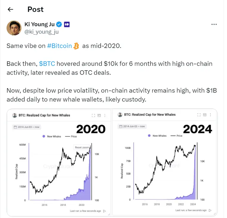 ChainCatcher 消息,CryptoQuant 创始人兼 CEO Ki Young Ju 在社交媒体上发文表示,比特币市场目前的氛围与 2020 年中期一样。当时 BTC 在 6 个月内徘徊在 10,000 美元左右,链上活动活跃,后来被揭示为场外交易。现在,尽管价格波动性较低,但链上活动仍然很活跃,每天有 10 亿美元添加到新的鲸鱼钱包中。