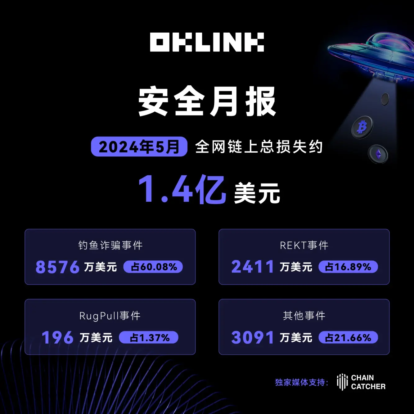 OKLink 5 月安全月报:5 月全网累计造成损失约 1.4 亿美元,其中钓鱼事件所致损失超过半数,占比 60.08%