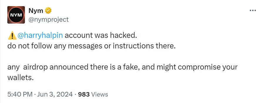 隐私项目 Nym CEO X 账户被盗并发布虚假空投信息,请用户当心风险