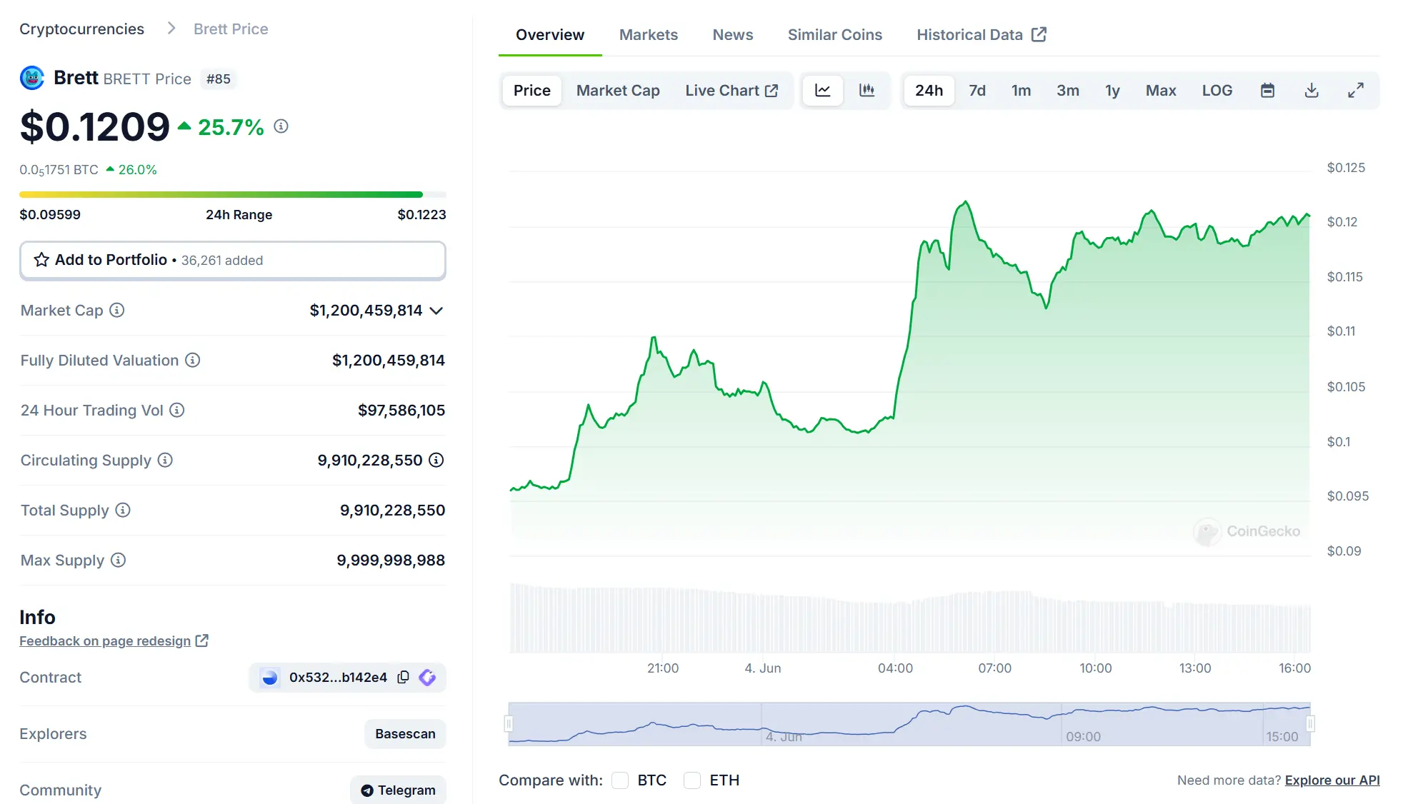 ChainCatcher 消息,CoinGecko 数据显示,Base 生态 Meme 币 BRETT 突破 0.12 美元,创历史新高;现报 0.1219 美元,24H 涨幅为 26.4%,其市值突破 12 亿美元。