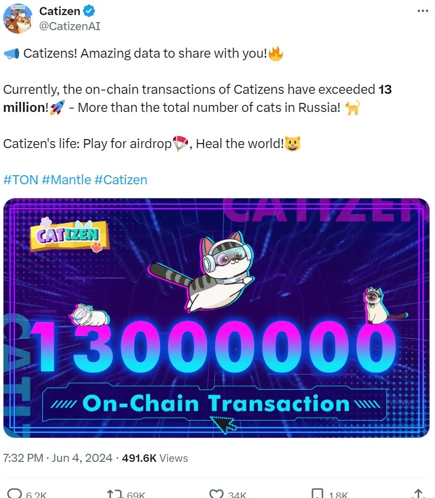 ChainCatcher 消息,据官方发文表示,Ton 链上元宇宙养猫游戏 Catizen 链上交易量已超 1300 万笔,拥有超过 1200 万玩家,超 73 万链上用户参与,链上交易数超 220 万条。