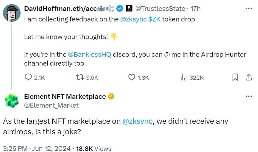 ChainCatcher 消息,NFT 交易平台 Element 在 X 平台中回复称,作为 ZKsync 上最大的 NFT 市场,平台并未收到任何 ZK 代币空投。