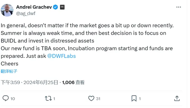 ChainCatcher 消息,DWF Labs 联合创始人 Andrei Grachev 表示,总的来说,近期市场涨跌并不重要。夏季总是市场疲软的时候,这时最好的选择就是关注 BUIDL,投资不良资产。我们的新基金即将推出,孵化计划已经启动,基金也已准备就绪。