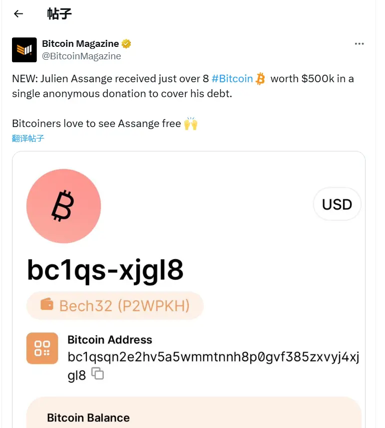 数据:阿桑奇在匿名捐款中收到 8 枚比特币,价值 50 万美元