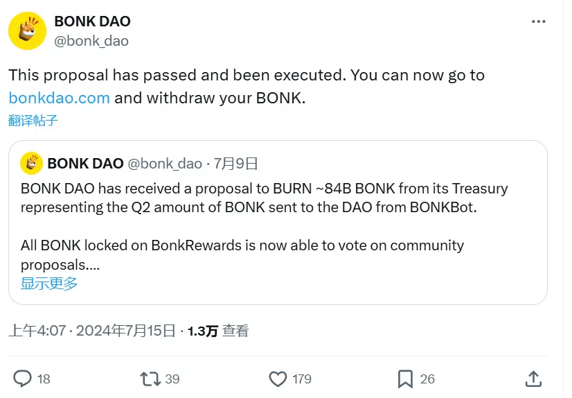 BONK DAO:销毁财库中约 840 亿枚 BONK 的提案已获通过并执行
