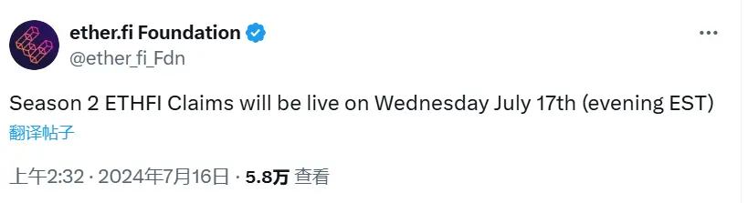 ether.fi:Season 2 空投申领将于 7 月 17 日开放