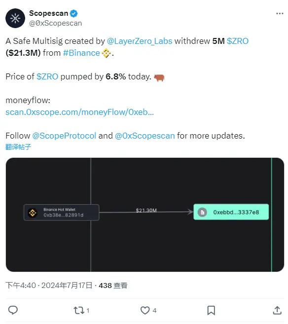 ChainCatcher 消息,据 Scopescan 显示,由 LayerZero Labs 创建的 Safe 多签地址从币安提出 500 万枚 ZRO,约合 2130 万美元。