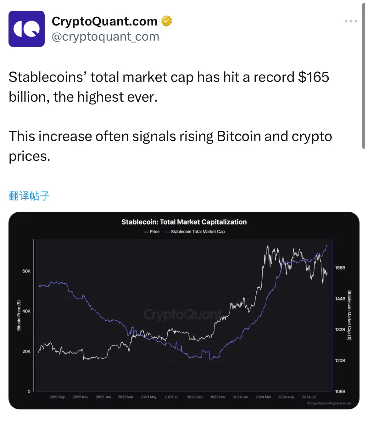 CryptoQuant:稳定币总市值已创新高,通常预示着加密货币价格上涨
