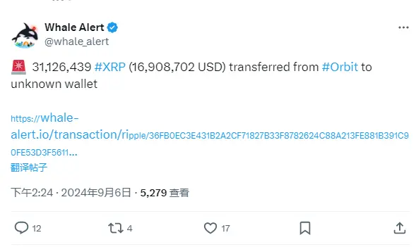 ChainCatcher 消息,据 Whale Alert 监测,31,126,439 枚 XRP (16,908,702 美元)从 Orbit 转移到未知钱包。