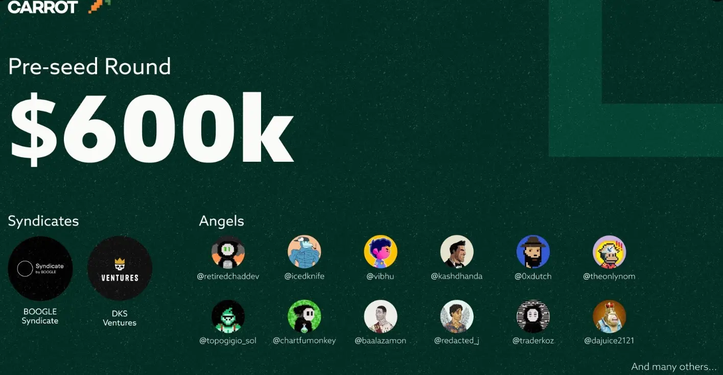 ChainCatcher 消息,Solana 收益优化协议 Carrot 完成 60 万美元的 Pre-seed 轮融资,BOOGLE 、DKS Ventures 及天使投资人 Retired Chad Dev 、DRiP 创始人 vibhu 、Nom 、Kash Dhanda 、ChartFu 、Iced 等参投。