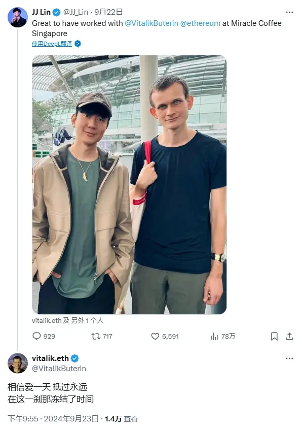 ChainCatcher 消息,以太坊联合创始人 Vitalik Buterin 在歌手林俊杰发布的二人合影推文留言表示,“相信爱一天,抵过永远。在这一刹那冻结了时间。”
