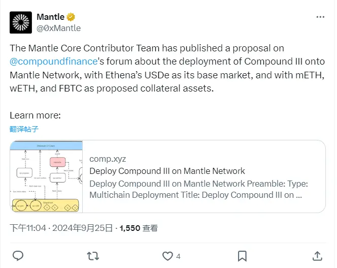 Mantle Network 提议将 Compound III 部署至 Mantle,以 USDe 作为基础市场