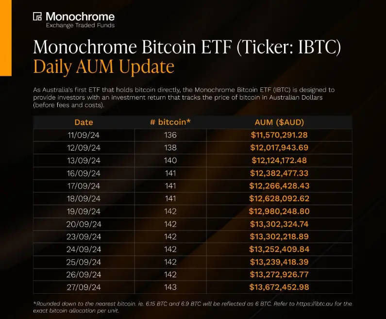 ChainCatcher 消息,据官方消息,澳大利亚 Monochrome 现货比特币 ETF(IBTC)截至 9 月 27 日持仓达 143 枚 BTC,AUM 约为 1367 万美元。