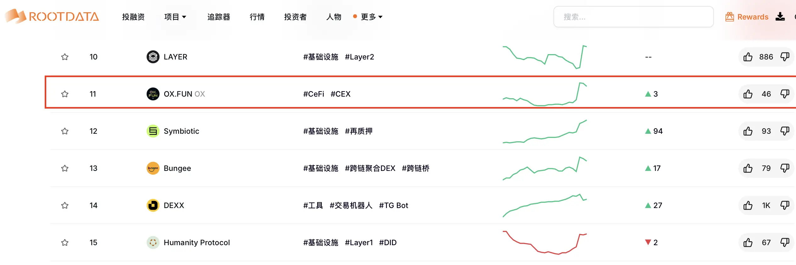 ChainCatcher 消息,据 RootData 数据,“Web3 热门项目排行榜”排名 11 的项目 OX.FUN 代币(OX)24 小时涨幅超 37%,现报 0.005618 美元。