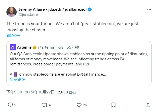 ChainCatcher 消息,稳定币发行商 Circle 首席执行官 Jeremy Allaire 在 X 平台发文称,趋势就是朋友,市场目前还没有达到“稳定币的顶峰”,我们只是在跨越鸿沟。