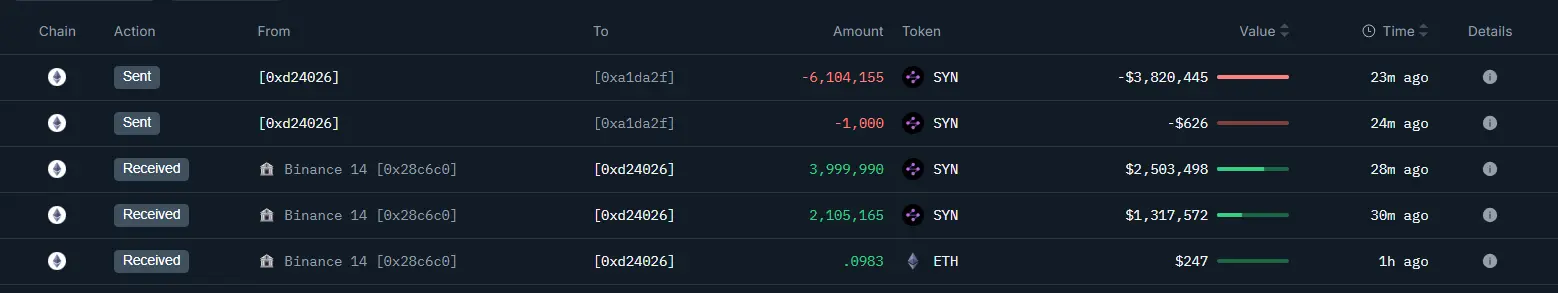 数据:某新建钱包从币安购买 610 万枚 SYN 后将其转至另一钱包